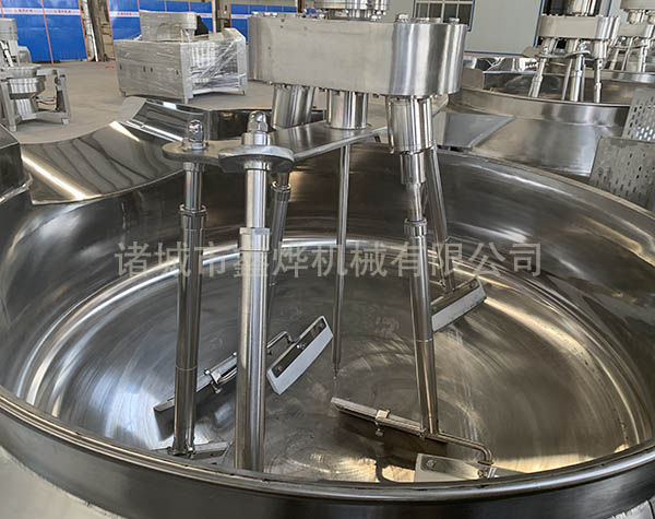 本設(shè)備有四頭攪拌、五頭攪拌和七頭攪拌,根據(jù)炒鍋容積和物料性質(zhì)來決定攪拌頭的數(shù)量。無需人工翻炒,鍋體液壓傾斜高位自動出料,設(shè)備有專門的進(jìn)料料斗,可以裝配乳化器。